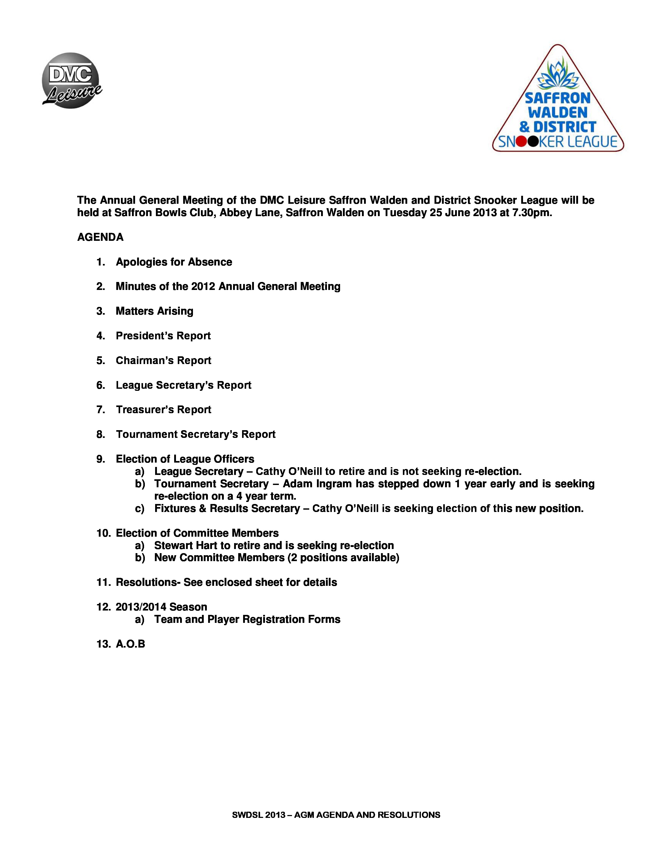 The AGM Agenda is as below, the Proposals to changes to the current League Rules are as SWDSL News Post dated 2 June 2013 and are also below.
