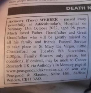 The DMC Leisure Saffron Walden & District Snooker League is saddened to learn this week of the recent passing of Tony Webber who many league members will remember was a key Committee member for many years taking on numerous roles including League Secretary and Tournament Secretary.
