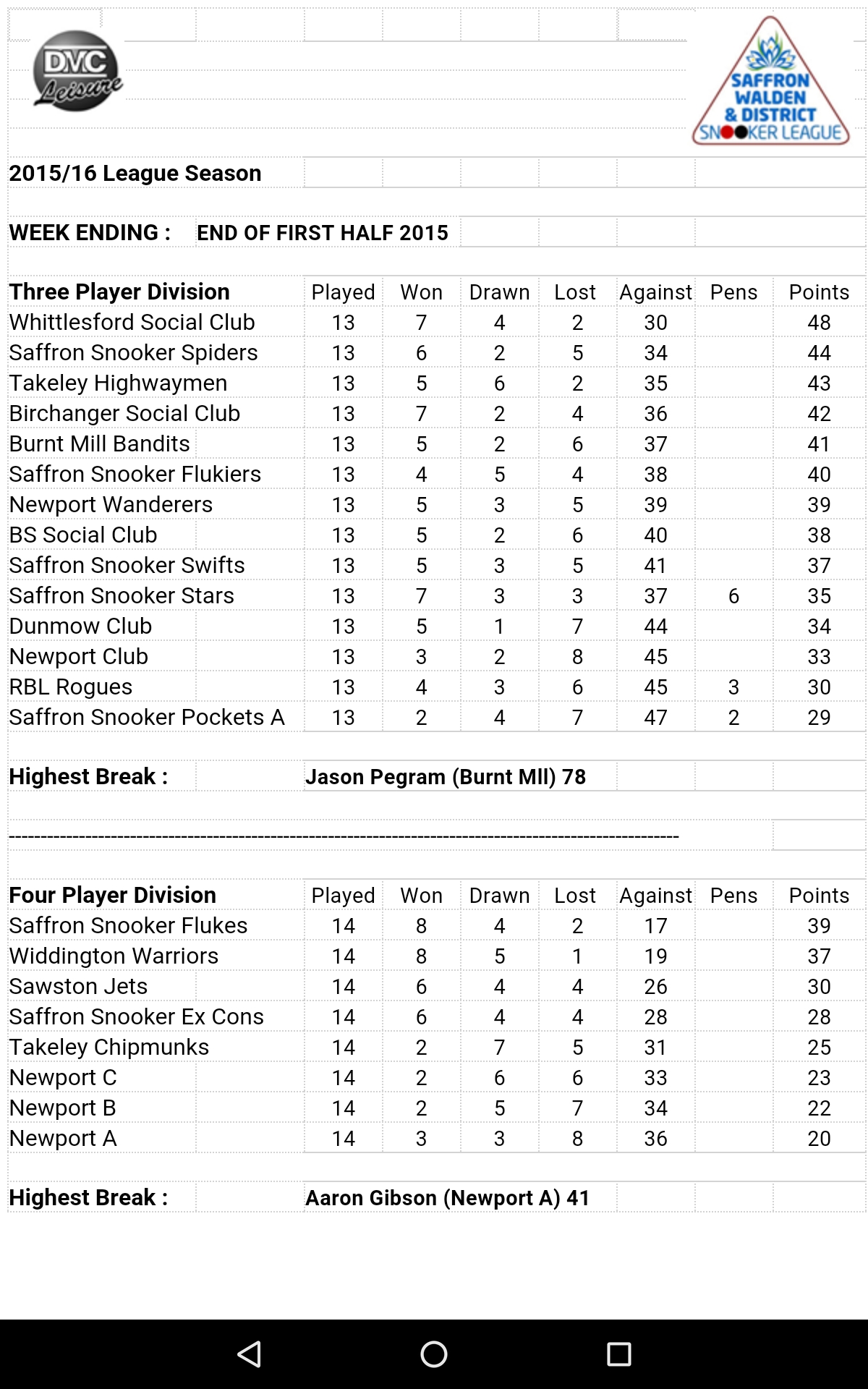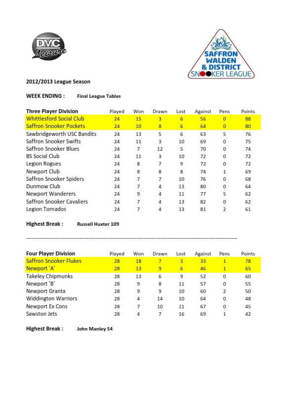 All recorded breaks over 25 in Three Player/Four Player league matches, League Cup, Handicap Singles, Handicap Doubles, Scratch Plus Singles, Scratch Singles, President’s Cup, Saffron Walden Challenge and Bishop’s Stortford Challenge tournaments.