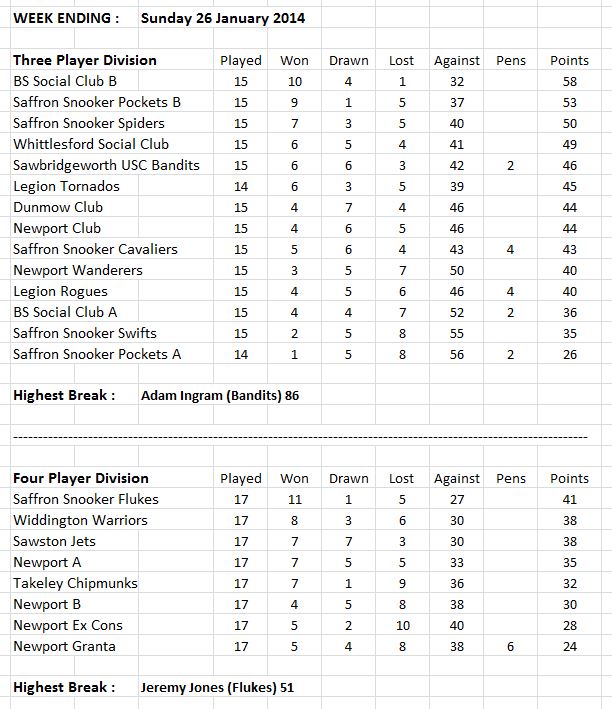 League Tables – Up to and including all matches to Wednesday 22 January 2014