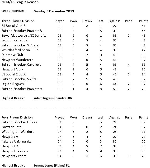 2013-14 League Season – High Break Leaderboard [5 January 2014]