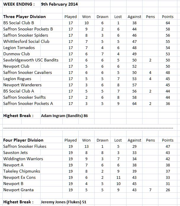 League Tables – Up to and including all matches to Wednesday 12 February 2014