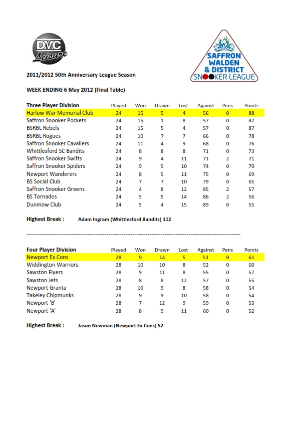 The 2015 Saffron Walden Challenge Snooker Tournament, once again kindly sponsored by Bushwood Accountants will take place at the Cambridge Snooker & Pool Centre, Coldhams Road, Cambridge, CB13EW, on Sunday 22 February 2015. The Club will be open from 10.30am to enable a prompt start at 11.00am.